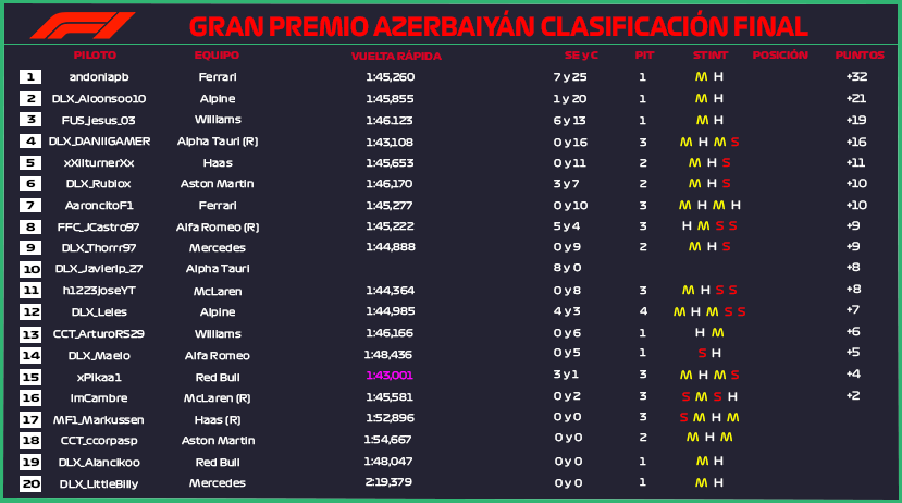 Tras los resultados en el GP de Bakú, andoniapb es quien salía más reforzado y asciende hasta el liderato del Mundial. Tras los tropiezos de DLX_Javierlp27 y AaroncitoF1, la lucha se ha puesto muy interesante.