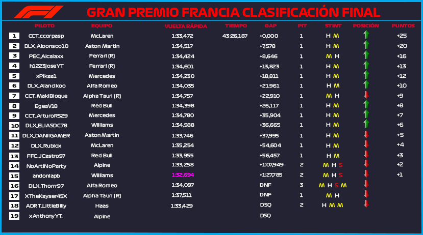 Al comenzar el Gran Premio hay una salida rápida y limpia, la estrategia la marca como duros/medios pero hay muchos cambios en la zona superior y el poleman con su Alpine decide meter un medio el cual le beneficia y le coloca con clara ventaja en la salida, solamente mantienen el duro CCT_corpasp y DLX_Aloonsoo10. Tras las primeras curvas y los primeros forcejeos comienzan a variar las posiciones iniciales, PEC_Alcalaxx pasa de ser cuarto a luchar de tú a tú con CC_corpasp, mientras el líder de la carrera se distancia. Un poco más atrás hay una lucha muy interesante a tres bandas entre el Aston Martin de DLX_Alonnsoo10 el Ferrari de H1223JoseYT y el AlphaTauri de CCT_MakiBioque. Pasada la segunda vuelta trompea NoArtiNoParty que iba líder y ya no sería visto en la zona superior de la tabla. A NoArtiNoParty le coge el relevo el Ferrari de PEC_Alcalaxx que se colocaba líder tras un arranque espectacular, pero le ocurriría algo muy parecido, y es que trompea yendo líder y cae hasta la tercera posición. Continúa la carrera sin más sobresaltos. Mientras los pilotos con medios comienzan a hacer la primera parada y los pilotos con duros comienzan a alargar su stint para sacar ventaja de ese compuesto, comienzan los cambios de posiciones tras las paradas en boxes, y la zona media de la tabla se compacta. Comienzan a saltar las primeras sanciones por track limits, hay varios abandonos pero no hay coche de seguridad en pista, y conforme va llegando el final de la carrera se va apretando la zona superior de la tabla, ya que los dos pilotos que alargaron su parada como el McLaren de CCT_corpasp, que tras su parada salía líder con un compuesto superior en rendimiento y más nuevo que sus perseguidores, y ya era carretera y manta para él, que tras el espectacular primer stint se embolsaba la victoria al final del Gran Premio. Por su parte el otro piloto que colocó el compuesto medio al final fue DLX_Aloonsoo10, que imprimió un ritmo muy alto y se colocaba muy arriba en la tabla de posiciones, y tras varios adelantamientos y acercarse a la cabeza de carrera conseguía terminar en tercera posición. Detrás un Ferrari manejado por PEC_Alcalaxx que consigue auparse hasta la segunda posición en un Gran Premio trepidante para él, pero una sanción de última hora le hacía perder la segunda posición al final del Gran Premio. Todo termina y se cierra el circuito de Francia.